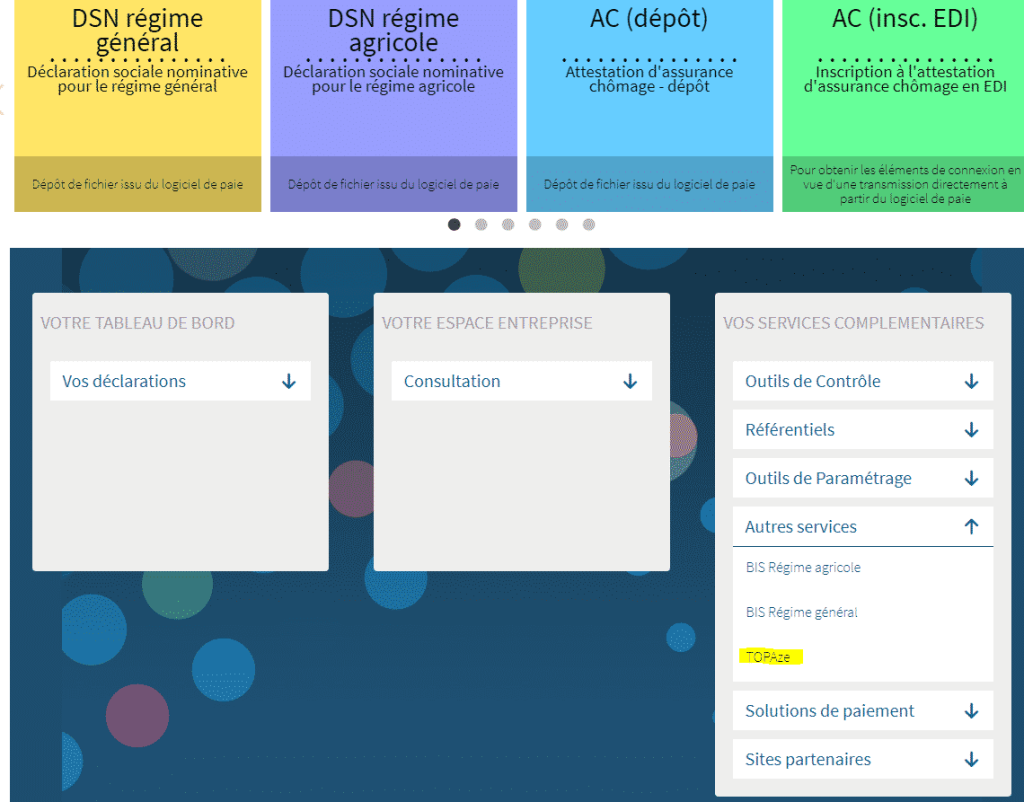Pour s’inscrire afin de récupérer le taux du PAS sur TOPAZE, il suffit de disposer d’un compte sur Net Entreprise. Le service est disponible dans le tableau de bord, un onglet TOPAZE est disponible dans “autres services”.